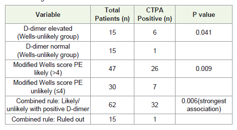 Conclusion: An integrated diagnostic approach combining Modified Wells Score, age-adjusted D-dimer, and CTPA improves diagnostic accuracy and optimizes utilization of imaging in suspected pulmonary embolism.