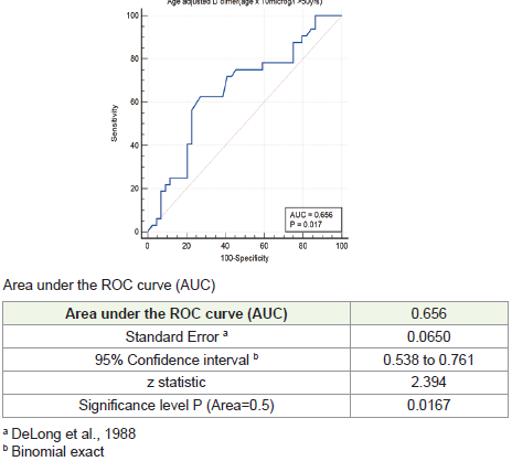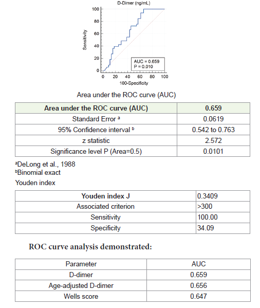 specificity, whereas age-adjusted D-dimer improved specificity.The ROC analysis showed an area under the curve (AUC) of 0.659,