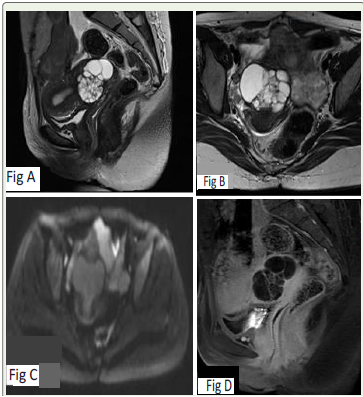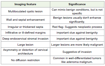 Classically, adenoma malignum has been described as a multilocular cystic lesion with enhancing solid components, cervical enlargement, and deep stromal invasion. In our case, cervical expansion and deep stromal invasion were present; however, solid components were not appreciable, even on retrospective review. The initial MRI revealed a multiloculated cystic cervical lesion with enhancing septa and walls, but without a solid component—features that overlap with benign lesions such as complex nabothian cysts, tunnel clusters, or deep endocervical glandular hyperplasia [2]. Nonetheless, the involvement of deep stroma, along with intense enhancement of septa and a gradual increase in septal thickness and cyst size on follow-up MRI, raised concern and ultimately led to surgical excision and a definitive diagnosis of adenoma malignum. Differentiating benign entities from adenoma malignum is particularly challenging when an enhancing solid component is absent. Several reports have documented benign glandular lesions— including tunnel clusters, deep endocervical glands, deep nabothian cysts, and lobular endocervical glandular hyperplasia—that can closely mimic adenoma malignum both histologically and radiologically [3]. Benign lesions generally do not invade the deep cervical stroma, are smaller in size, demonstrate well-defined margins, and typically lack solid components. The transition from hyperplasia to highgrade malignancy appears to represent a continuous spectrum, with the proportion of solid components within a lesion serving as a key determinant. Profuse mucinous vaginal discharge is the most common clinical presentation. The risk is heightened in patients with Peutz– Jeghers syndrome, who have a significantly increased lifetime risk of gynecologic malignancies, particularly adenoma malignum. Therefore, close surveillance is warranted in such high-risk populations. MRI plays a pivotal role in early detection. Adenoma malignum often appears as a multicystic lesion with a characteristic “honeycomb” appearance, thin septations, and variable wall or septal enhancement [Table 1]. While the presence of a solid component or nodularity raises suspicion for malignancy, cases such as ours-entirely cystic without a solid nodule—pose diagnostic difficulty. On MRI, these lesions are usually isointense or slightly hyperintense relative to the uterus on T1-weighted imaging and markedly hyperintense on T2-weighted imaging. A T2 hyperintense solid component, when present adjacent to cysts, may enhance following gadolinium administration. Radiologic–pathologic correlation has shown that these apparent solid areas often represent clusters of minute cysts with edematous cervical stroma rather than true solid tissue [4]. Thus, the absence of a solid component on imaging does not exclude malignancy, as microcysts or stromal edema may mimic cystic spaces. However, true solid nests may be observed in aggressive or dedifferentiated forms.
