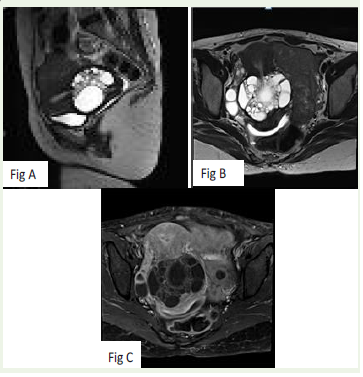 mucoid discharge. Transvaginal ultrasound revealed a multiloculated