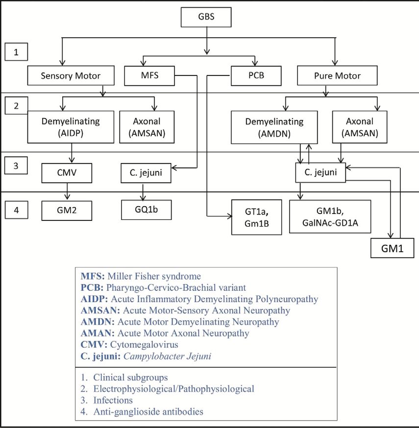 Classification of subgroups is possible on different levels of the disease and characteristic on several levels of the disease can be found in one subgroup (Table 2) and Figure 2(a). Moreover, it has been described between PCB and antibodies against GT1a and GM1b (Koga, M et al., 2000; Mizoghichi, K et al., 1994; Koga, M et al., 1998;Koga, M et al.,1999). [12-15]