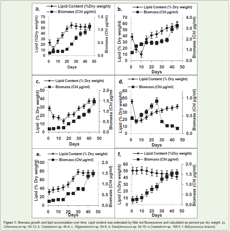 (culture age) and lipid accumulation was observed in most strains tested (Coelastrum sp. strain 46-4 and strain 108-5, Chlorococcum sp. strain 64-12,