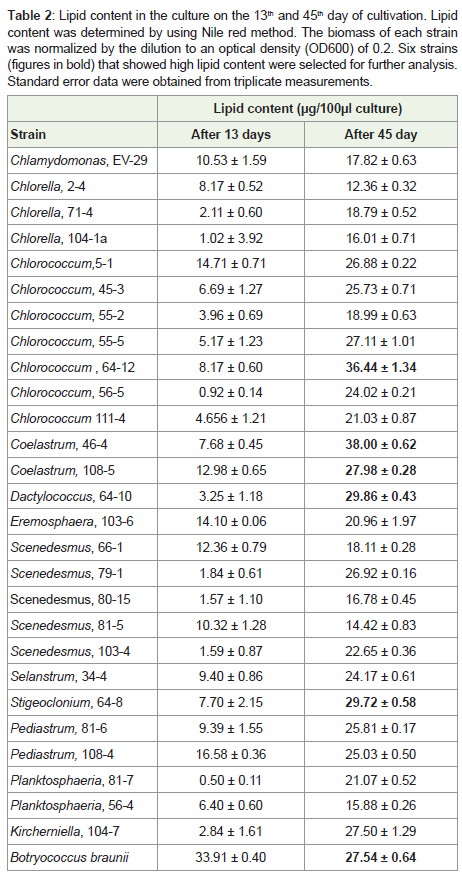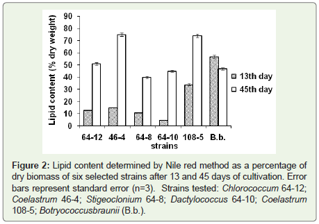 contained more than 50% of lipid of dry biomass (Coelastrum 108-5, Chlorococcum 64-12 and Stigeoclonium 64-8) and therefore were identified as potential