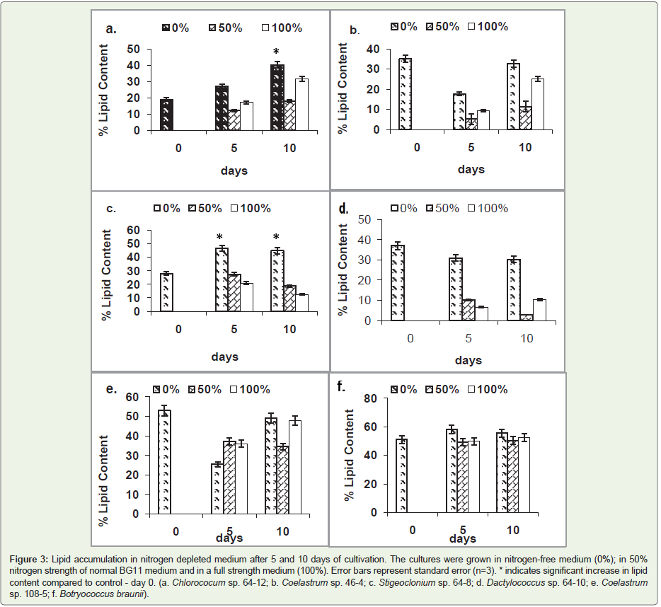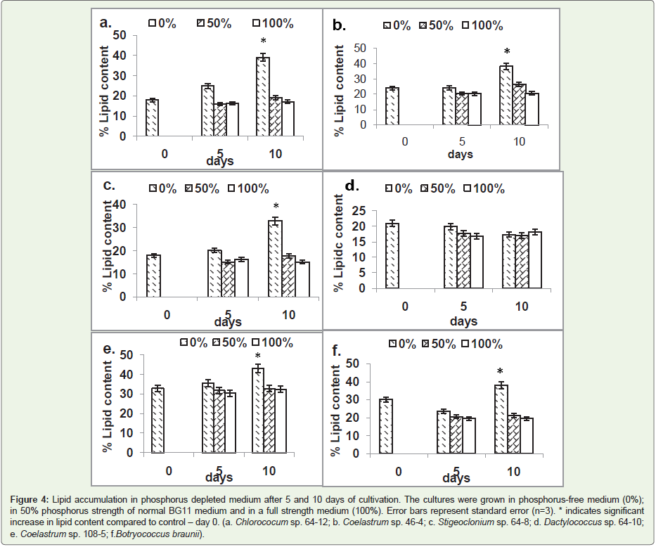 Figure 4: Lipid accumulation in phosphorus depleted medium after 5 and 10 days of cultivation. The cultures were grown in phosphorus-free medium (0%); in 50% phosphorus strength of normal BG11 medium and in a full strength medium (100%). Error bars represent standard error (n=3). * indicates significant increase in lipid content compared to control – day 0. (a. Chlorococum sp. 64-12; b. Coelastrum sp. 46-4; c. Stigeoclonium sp. 64-8; d. Dactylococcus sp. 64-10; e. Coelastrum sp. 108-5; f.Botryococcus braunii).