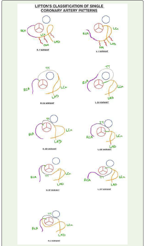 Table 1:Summary of Lipton classification of single coronary artery (SCA) anomalies and comparison with previously reported anomalous coronary patterns.