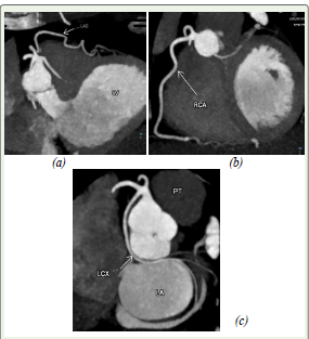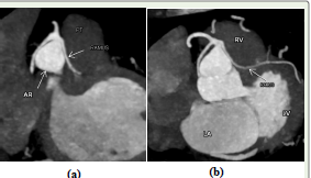 Figure 2: (a) and (b) show oblique reformatted CT angiographic image