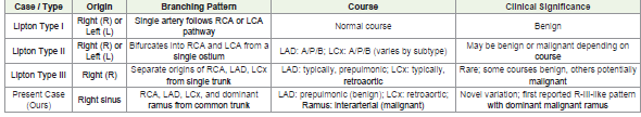 The table outlines key features of each Lipton subtype (Types I–III), highlighting differences in origin, branching, course of the coronary arteries and compares it to our case.