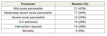 Based on the Revised Atlanta Classification, [3] 21 patients (42%) had mild acute pancreatitis, 17 (34%) had moderately severe disease, and 12 (24%) had severe acute pancreatitis. ICU admission was required in 14 patients (28%), interventional procedures were performed in 10 patients (20%), and 4 patients (8%) died [Table 2].