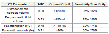 Peripancreatic fluid volume demonstrated good performance (AUC 0.83) at a cutoff >150 mL. Increased peripancreatic fat attenuation showed moderate predictive value (AUC 0.78; cutoff > –45 HU), while percentage pancreatic necrosis demonstrated lower accuracy (AUC 0.71; cutoff >30%).