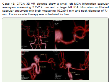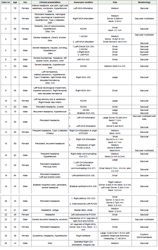 Keywords:Subarachnoid Hemorrhage; Fusiform Aneurysm; Dolichoectasia; Bilobed Aneurysm; Mycotic Aneurysm; Giant Aneurysm; Computed Tomography Cerebral Angiography