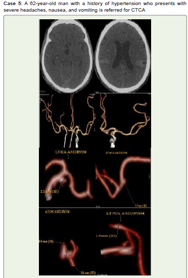 Objective: Saccular (berry-shaped) aneurysms that develop at arterial bifurcations—branch points where an artery splits into two branches—are the most common type of intracranial aneurysms, which are aberrant focal dilatations (localized bulges) of cerebral arteries. When they burst, cerebral artery aneurysms (CAA) pose a serious risk of morbidity and death. This case series aims to analyze computed tomography cerebral angiography (CTCA), a