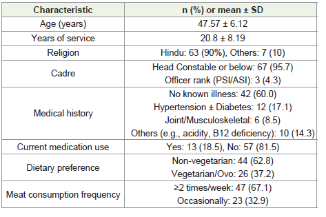 Conclusion: Traffic police personnel in Belagavi exhibit a high burden of modifiable health risks related to nutrition, physical inactivity, and occupational strain. Multi-component health interventions targeting diet, physical activity, and recovery behaviors are urgently needed to improve health outcomes and occupational sustainability in this workforce.
