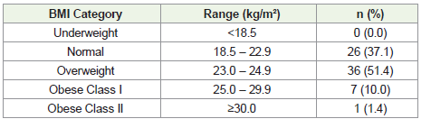 According to WHO classification for Asian populations, more than half of the participants (51.4%) were overweight, and an additional 11.4% were obese (Class I and II combined). No participants were under-weight. These findings reinforce the elevated