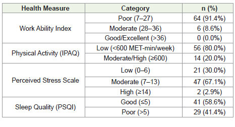 Results: The mean age of participants was 47.57 ± 6.12 years. The mean BMI was 26.25 ± 3.31 kg/m², with 62.8% of participants classified as overweight or obese. Dietary intake exceeded recommended daily allowances for energy and macronutrients, while only 8.6% had good dietary diversity. Low physical activity was reported by 80% of participants, 67.1% experienced moderate stress, and 41.4% had poor sleep quality. Work ability scores were poor in 91.4% of cases. Significant associations were found between BMI and both work ability (p = 0.04) and sleep quality (p = 0.02).