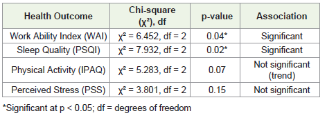 Methods: A cross-sectional study was conducted among 70 traffic police personnel aged 40 to 60 years in Belagavi, Karnataka. Data on nutritional status were obtained through anthropometric assessments, three-day 24-hour dietary recall, and a food frequency questionnaire (FFQ). Health outcomes were assessed using the Work Ability Index (WAI), International Physical Activity Questionnaire (IPAQ), Perceived Stress Scale (PSS), and Pittsburgh Sleep Quality Index (PSQI). Descriptive statistics, Pearson correlation, and Chi-square tests were employed for analysis. P value less than 0.05 was considered as significant.