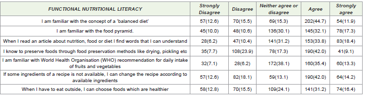 Methodology:Between December 2023 and February 2024, a cross-sectional survey was conducted with 452 randomly selected undergraduates from four varied colleges. A validated piolet-tested tool assessed sociodemographic, nutrition literacy and risk perceptions, with reliability indexes (Alpha- Cronbach:0.84–0.83) indicating internal consistency. Descriptive statistics was used in analysing the data in SPSS v28.