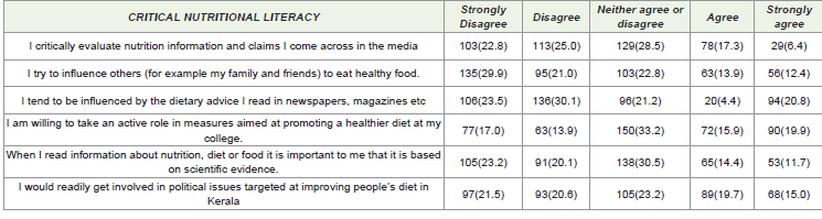 The findings suggest overall low to moderate critical nutritional literacy of respondents. More than three-quarters of respondents (77.4%) disagreed or strongly disagreed with the statement that they critically appraise nutrition information from media, and fewer than a quarter (23.7%) endorsed the statement. Correspondingly, only 26.3% tried to influence their peers’ healthy eating behaviour and more than half (50.9%) did not. More than half (53.6%) the students disregarded newspapers and magazine advice, although 20.8% found it influential. The inclination to participate in political issues targeted at improving people’s diet was moderate (35.8%), however one third of students answered neutrally. Only 26.1% reported that they believe in scientific evidence in nutrition information and 43.3% deny it. Political participation in relation to dietary factors within Kerala was also low, with 34.7% of participants who would be willing to be part of this and 42.1% who would not.