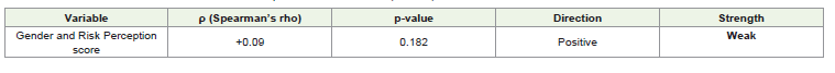 The correlation between gender and risk perception (ρ = +0.09, p = 0.182) was weak and statistically non-significant. This suggests that male and female students exhibit comparable levels of perceived risk regarding food additives and processed foods. Although females recorded slightly higher mean perception scores (3.57) compared to male (3.49), the difference was not strong enough to indicate a gender-based variation in overall awareness or concern.