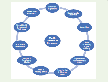 Horse gram (Macrotyloma uniflorum) is an indigenous legume that has historically played an important role in the traditional diets of rural and hilly regions of India. Though categorized as a neglected underutilized pulse crop, recent scientific interest has spotlighted its potential as a nutrient-dense, climate-resilient food with a wide range of therapeutic properties. Horse gram is known by various regional names such as kulthi, kulattha, kollu, gahat, kurti-kalai, kolatha, ullavallu, and madras gram. Horse gram is well adapted to semi-arid and marginal environments and requires minimal agricultural input, making it highly suitable crop for sustainable farming systems [1,2] From a nutritional perspective, horse gram is rich in plant-based protein, complex carbohydrates, dietary fiber, essential minerals, and vitamins. It provides a well-balanced amino acid profile and is particularly abundant in iron, calcium, phosphorus and molybdenum and many vitamins like niacin, thiamine, and riboflavin [1,4]. In addition to its macronutrient and micronutrient profile, horse gram contains a rich array of bioactive compounds, including polyphenols, flavonoids, phytosterols, tannins, saponins, and phytic acid. These compounds have been associated with antioxidant, anti-inflammatory, antidiabetic, hypolipidemic, and antimicrobial activities [5-8]. These nutritional attributes have led researchers to classify horse gram as a promising crop for addressing protein energy malnutrition and micronutrient deficiencies in low-income populations [9].