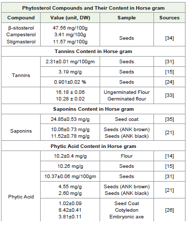 minerals such as calcium and iron. Beyond its macronutrient and micronutrient content, horsegram is rich in bioactive phytochemicals including phenolic acids, flavonoids, phytosterols, tannins, saponins, and phytic acid, which contribute to its antioxidant, anti-inflammatory, anti-diabetic, and lipid-lowering activities.