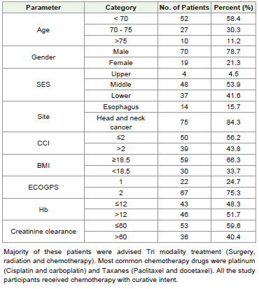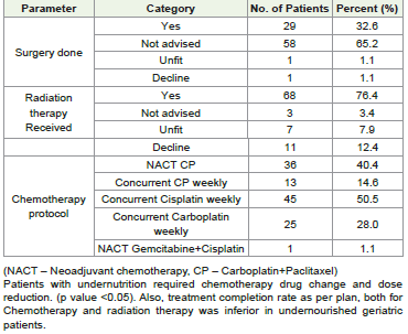 Results:Out of total 89 patients, 78.7% were males, 95.5% patients were from middle and lower SES, 84.26% patients had HNC and 15.74% esophageal cancer. Patients with metastatic disease were not included in this study. At baseline presentation, as per BMI 33.7% patients were malnourished. On geriatric assessment, malnourishment (BMI < 18.5) was associated with presence of co-morbidity (p value <0.05). Patients with malnutrition required chemotherapy protocol modification and dose reduction (p value <0.05). Treatment completion rate for Chemotherapy and radiation therapy was inferior in malnourished geriatric patients. Primary progression while on treatment was noted in 10 patients with BMI < 18.5 and in 9 patients with BMI ≥ 18.5 (p value - 0.04). Although HR QOL global mean score and Overall survival were inferior in malnourished patients, it was statistically not significant.