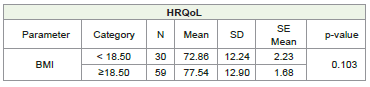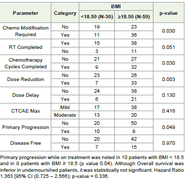 Materials and Methods:This observational study was conducted at M.S. Patel Cancer Center, Shreekrishna Hospital, Bhaikaka Univeristy, Karamsad, Gujarat, India. The Geriatric cancer patients diagnosed with HNN and esophageal cancer, being treated with curative intent chemotherapy were enrolled in the study from April 2021 to March 2023. Total 89 patients were included in this study. Baseline clinic-pathological data including geriatric assessment was noted. Based on body mass index (BMI) patients were dichotomized in to BMI < 18.5 i.e. undernourished and ≥18.5. An assessment of treatment outcomes including survival as per nutrition status was done.