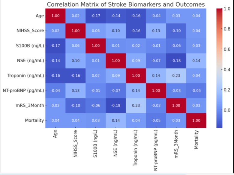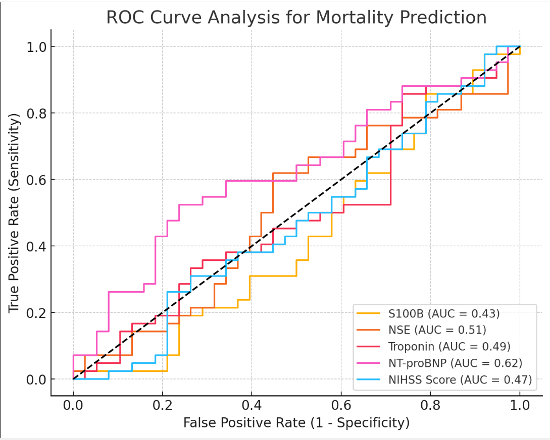 Results: Among the biomarkers analyzed, NT-proBNP showed the strongest correlation with NIHSS scores, indicating its potential as a predictor of stroke severity. S100B and NSE exhibited weaker associations, while troponin levels had minimal correlation with clinical severity. The overall mortality rate was 56.25%, with significantly higher NT-proBNP levels observed in non-survivors. These findings suggest that while NT-proBNP may serve as a useful prognostic marker, a combination of clinical assessment and biomarker evaluation is necessary for accurate risk stratification in AIS patients.
