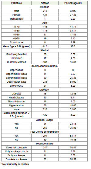 With respect to lifestyle behaviors, 291 participants (83.14%) reported regular consumption of tea or coffee, 81 (23.14%) consumed alcohol, and 247 (70.57%) reported not using any tobacco products. [Table 1]