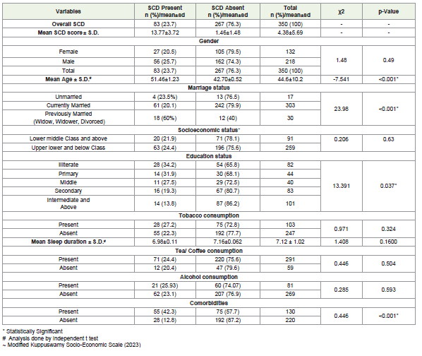 Methods: A cross-sectional study was conducted among 350 adults aged ≥30 years residing in a North Indian urban underprivileged community. SCD was assessed using the SCD-Q21 scale. Socio-demographic and co-morbidity data were obtained via a structured questionnaire. Associations were examined through chi-square test and multiple logistic regression analyses.