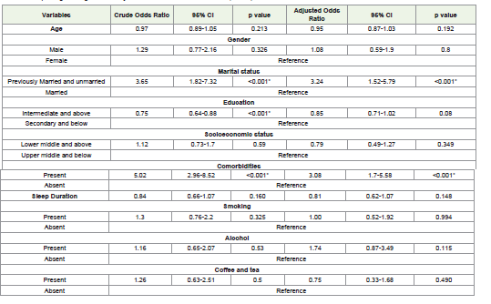 Also, participants with co-morbidities also had higher odds of SCD with crude OR = 5.02 (95% CI: 2.96–8.52, p < 0.001) and adjusted OR = 3.08 (95% CI: 1.70–5.58, p < 0.001). Other factors— including age, education level, socioeconomic status, tobacco use, alcohol consumption, and caffeine intake—did not show statistically significant associations in the multiple logistic regression analysis. [Table 3]