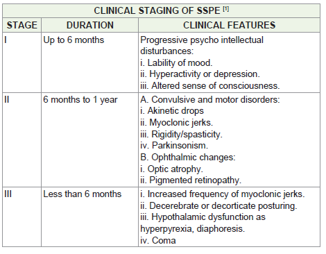 and decorticate posturing fall into the clinical staging of SSPE [Table 1].