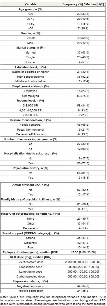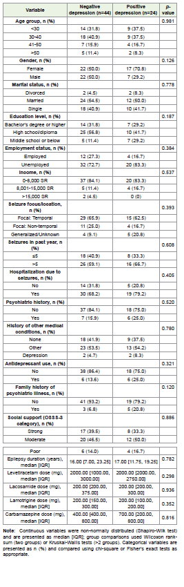 Methods: A cross-sectional study was conducted from January 2024 to August 2025, enrolling adult patients with a confirmed epilepsy diagnosis admitted to the Epilepsy Monitoring Unit. Data were collected using structured questionnaires including demographic and clinical variables such as the Neurological Disorders Depression Inventory for Epilepsy (NDDI-E), and the Oslo Social Support Scale (OSSS-3). Associations were examined using chisquare and non-parametric tests due to the non-normal distribution of variables, followed by multivariable logistic regression. A p-value <0.05 was considered to determine statistical significance.