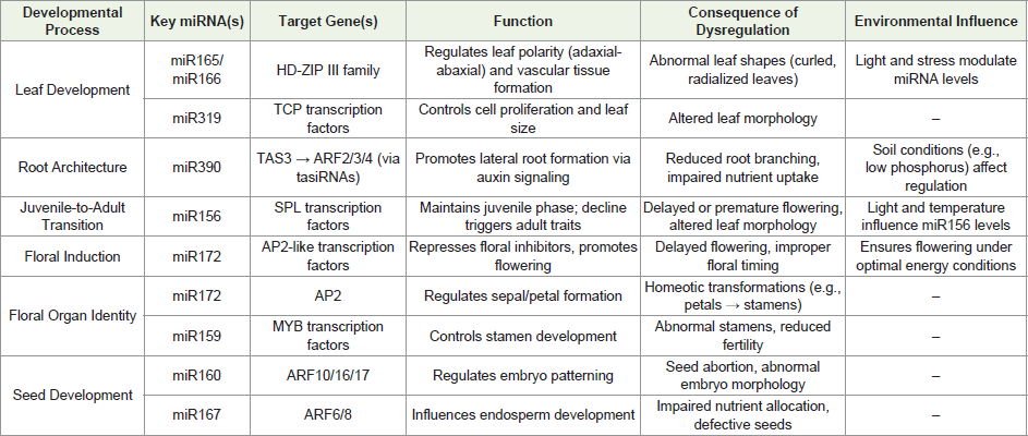 transcription and processing to their integration into RNA-induced silencing complexes (RISCs). We highlight their spatiotemporal regulation of key developmental processes—including leaf morphogenesis, root architecture, phase transitions, and reproductive development—and their adaptive roles in abiotic (drought, salinity, nutrient deficiency) and biotic (pathogens, herbivores) stress responses. The evolutionary conservation of miRNA pathways across plant species underscores their functional significance, while emerging biotechnological applications, such as engineered miRNAs and CRISPR-based editing, offer innovative strategies for crop improvement. By synthesizing current advances and future