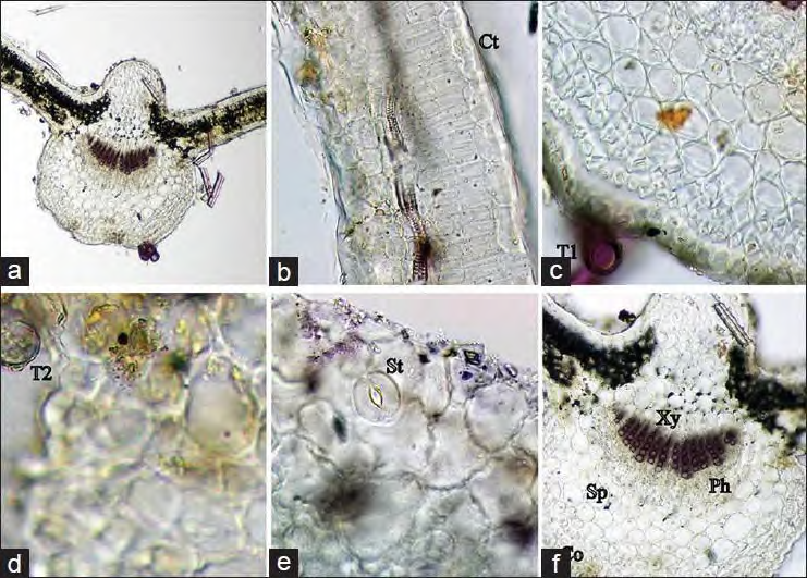 Figure 2(a) Transverse section of leaf passing through midrib. (2b) Transverse section of leaf lamina. (2c) Transverse section of midrib showing collenchyma covering trichome. (2d) Surface view of leaf for glandular trichome. (2e) Surface view of leaf for stomata. (2f) Transverse section of leaf passing through midrib Ct: Cuticle, T1: Covering trichome, T2: Bi-cellular sessile glandular trichome, St: Stomata, Xy: Xylem, Ph: Phloem, Sp: Spongy parenchyma, Co: Collenchyma.