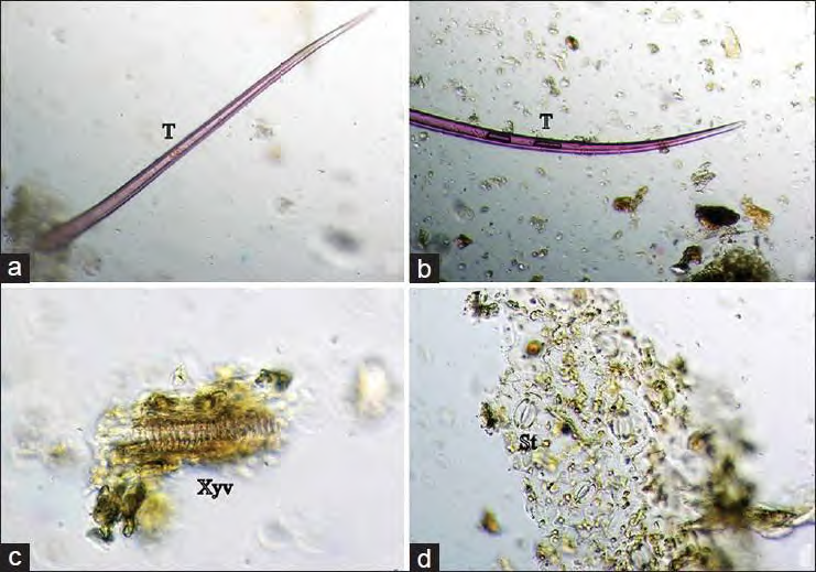 Figure (3a-3d): Powder microscopy of leaf. T: Unicellular, lignified, covering trichome, XyV: Xylem vessel, St: Anisocytic stomata