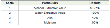 chlorophyll a and b concentrations of 0.0282 mg/g and 0.0560 mg/g in the alcoholic extract, respectively, and extractive values of 68.75% (alcohol) and